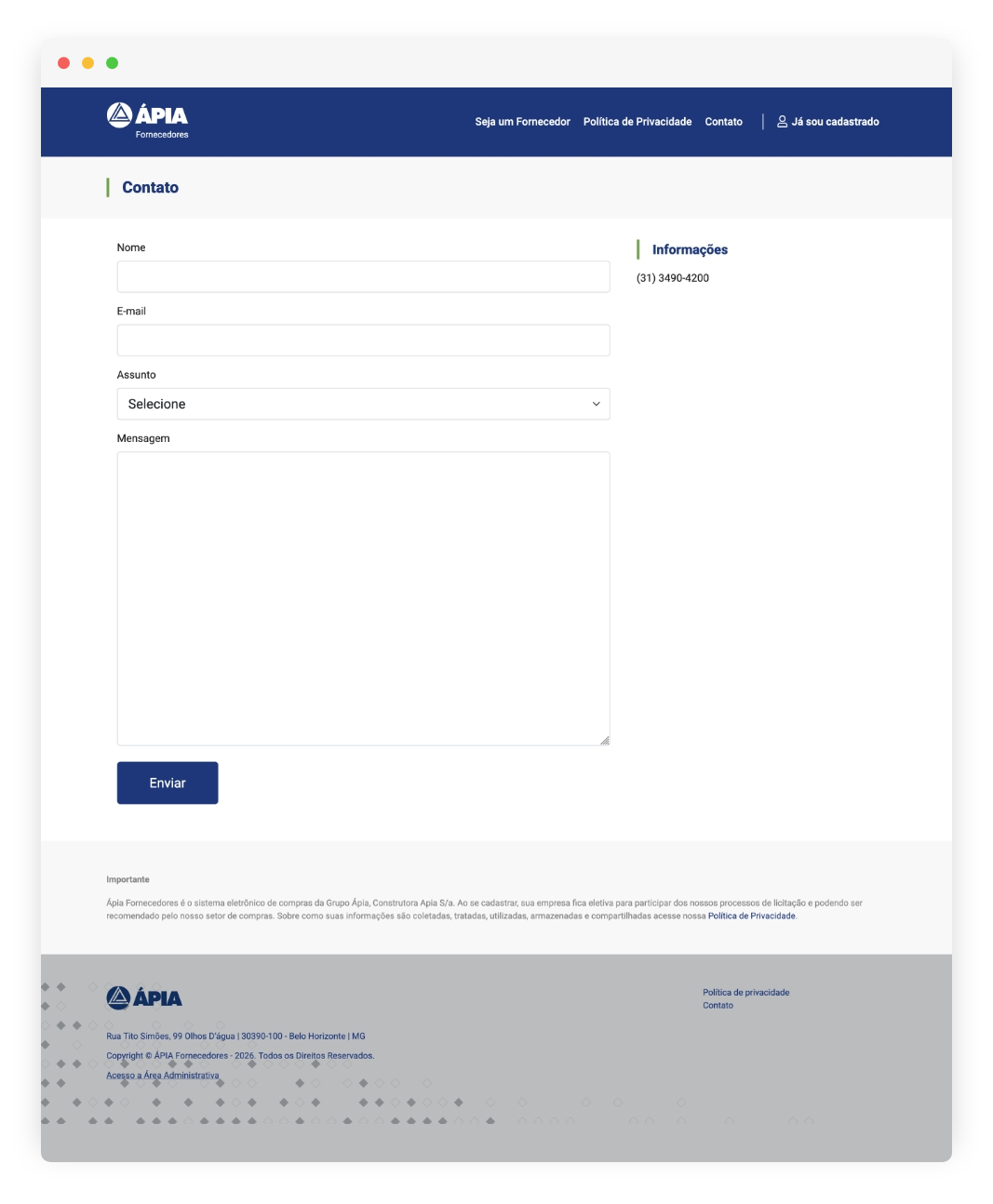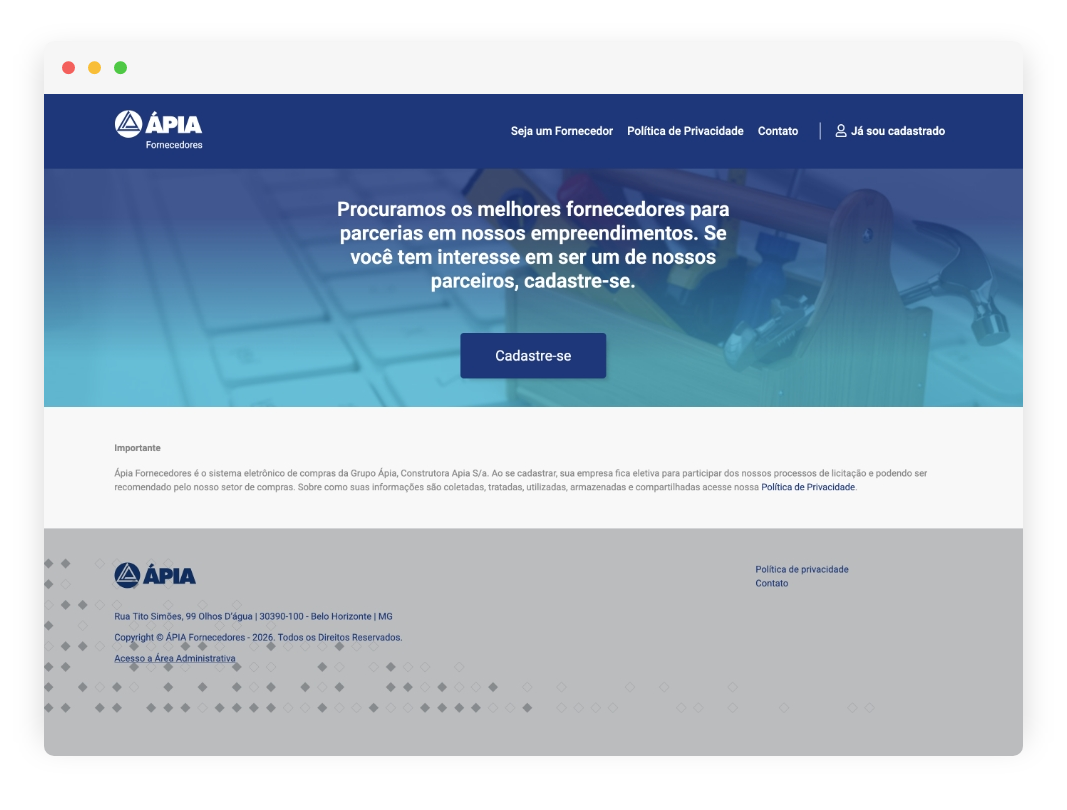 Ápia Fornecedores é o sistema online de compras do Grupo Ápia e da Construtora Ápia S/A.